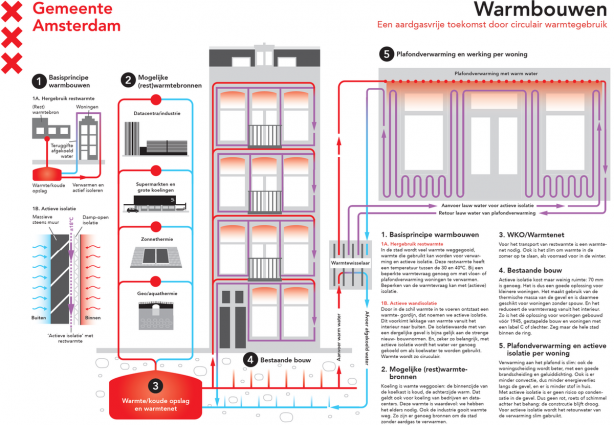 WarmBouwen is een techniek die gebruik maakt van restwarmte bij het isoleren van woningen. De techniek zorgt ervoor dat de buitenschil van de woning op temperatuur blijft waardoor er vrijwel niet verwarmd of gekoeld hoeft te worden. De restwarmte wordt door dunne buisjes in combinatie met (duurzaam) isolatiemateriaal op de wand geplaatst. De techniek is makkelijk te plaatsen, het isolatiemateriaal is slechts enkele centimeters dik en daardoor makkelijk toe te passen in de bestaande woningen in Amsterdam (zie de infographic voor een duidelijke toelichting).