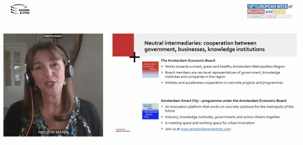Just like the EU, our Amsterdam Metropolitan Region is aiming for a green and inclusive recovery. That is why we are working on our own regional Green Deal, together with the business and knowledge sector. While I cannot share the outcome of this process yet, as that is expected in December, I can provide you with some examples today. Together we will establish programmes in which we will reskill and upskill citizens who have lost their jobs due to the crisis towards green and tech jobs. This is a short-term measure, with initiatives that have already started and will be replicated and upscaled. We will also join forces to change the relevant curricula of all levels of education towards a greener economy, which is a measure for the longer term.