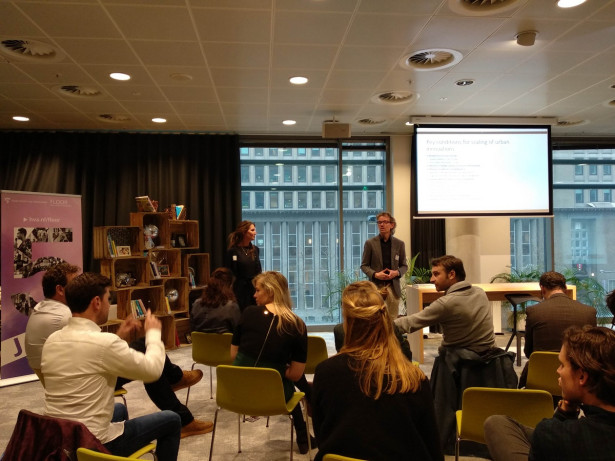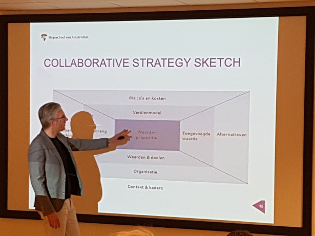 Jeroen Kraaijenbrink gave a masterclass about the collaborative business modeling method. This is a tool to reach a joint business model with various stakeholders and is the result of a European program (SURF Pop Up). Partners applied the methodology and made a collaborative business model canvas. They made a canvas for the De Bretten area, a green zone in the west of Amsterdam which is under pressure because of an increase of houses and people, and for realising an upcycle center, a center that replaces a traditional dumping ground, in the north of Amsterdam.