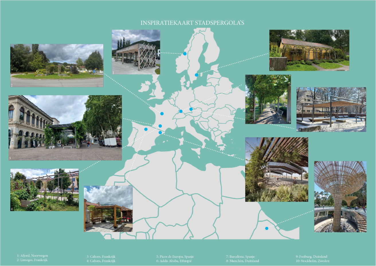 - Inspiratiekaarten met voorbeelden van Stadspergola’s internationaal en nationaal. Dit zijn voorbeelden van stadspergola’s die wij hebben ontvangen van collega’s, vrienden, familie en andere betrokkenen. Er zijn vast nog meer voorbeelden te vinden, maar het roept de vraag op wat nu precies een stadspergola is: